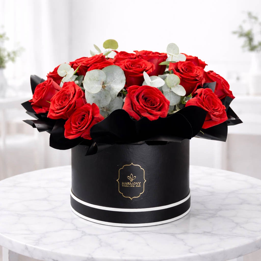 A timeless arrangement of premium red roses styled in a luxurious black box for a bold statement.